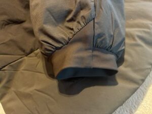 袖の部分ですが、風が入り込まないようにちょうどよく絞られています。斜めの切込みもオシャレですよね。艶感もあって都会的なデザインになっています。