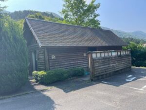 それに女性、子供連れだとチェックしておきたい点だと思います。これは駐車場にあるトイレです。このトイレは木造ですが、キャンプサイトにあるトイレはすべてコンクリートです。洋式が1つありますが他は全て和式です。
